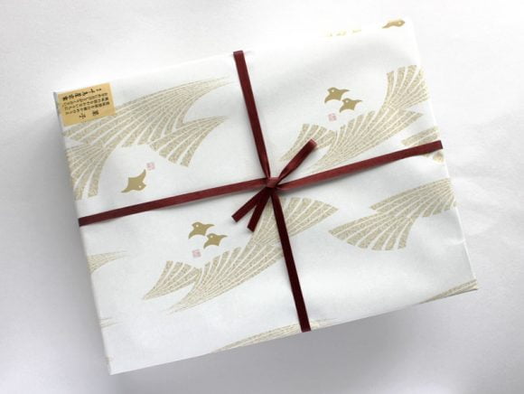 和紙柄の包装には二羽の鳥が羽ばたいている様子が描かれています。包装を丁寧に開けて中のおまんじゅうを取り出します。