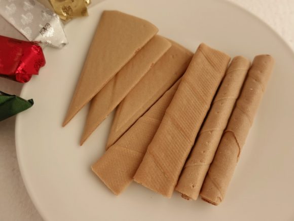 神戸の人気土産菓子として、また地元の人にも愛されるエコルセは、生地を薄く焼いて、三角、短冊、丸型に巻き上げたお菓子で、「空気のように軽い」と商品説明にあるほど、軽い食感となっています。