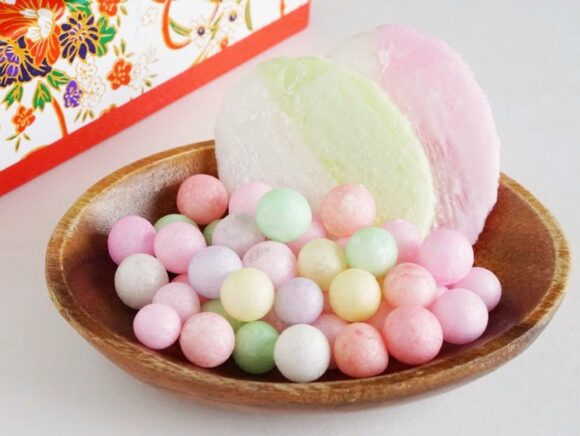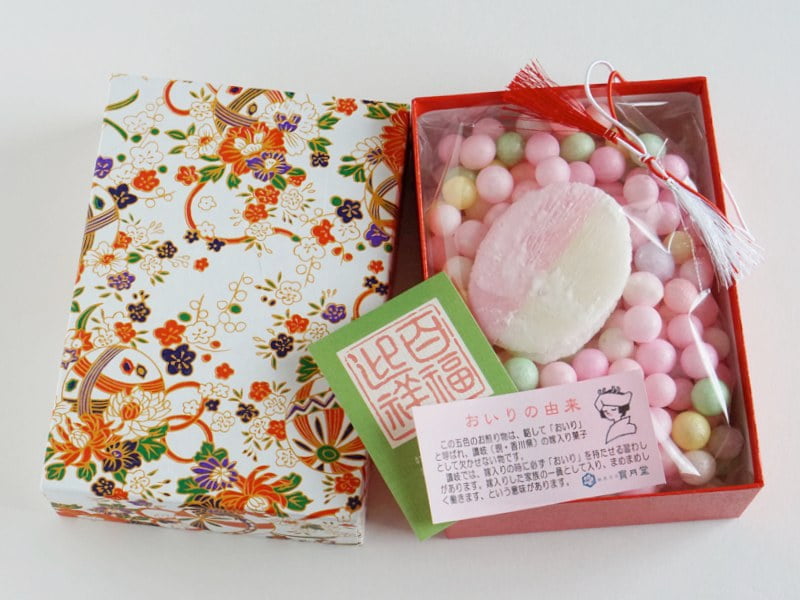 中には白・ピンク・黄色・みどり・薄紫の5色のおいりが入っています。