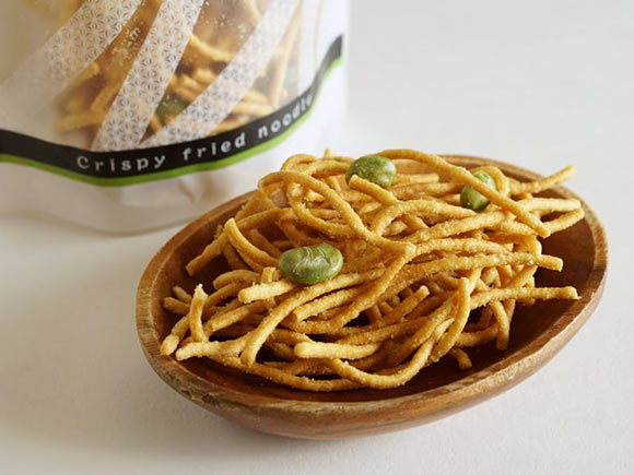 トッピングとして入れられた枝豆と、太麺のざくざく食感が楽しめるお菓子です。