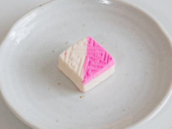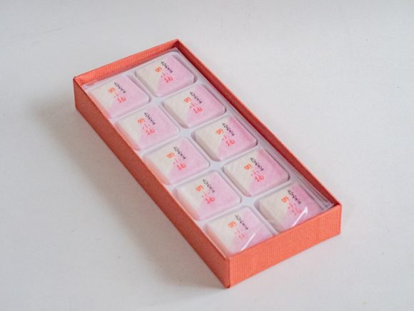 姫小袖は一辺3cmの正方形で、高さは1.5cmほどのキューブ状の形をしています。