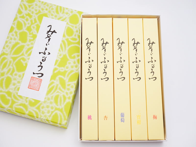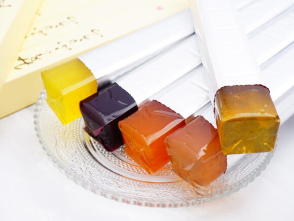 羊羹でありながらも、ゼリーのようにみずみずしいのが特徴的。杏・梅・ぶどう・もも・三宝柑といった5種類の味を楽しむことができます。