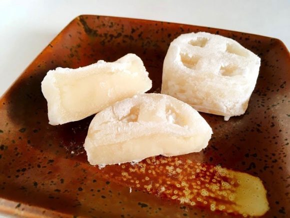 生地は米粉と砂糖を合わせたシンプルなもの。薄めのお餅はほろりと柔らかく、あまり伸びないタイプです。