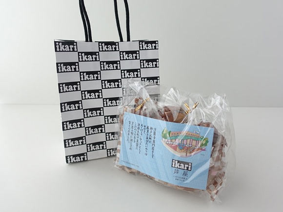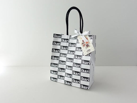 Ikariというロゴが千鳥柄のようにデザインされた買い物袋が特徴的です。