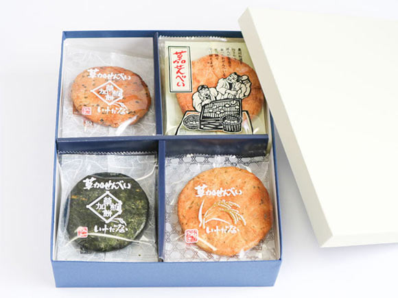 その中から「本造り草加せんべい・磯巻き・胡麻・ あおさ」の4種が4枚ずつ入った、詰め合わせ(1,080円)を購入しました。