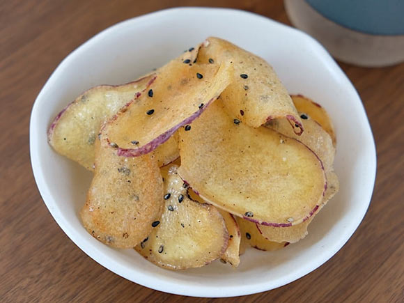 濃厚な甘さが特徴の紅はるかを皮ごと薄切りにしてパリッと揚げ、香ばしい黒胡麻がまぶされている一品です。