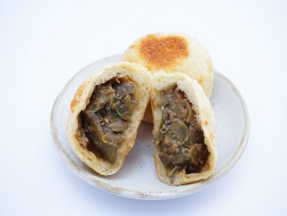 おやきを割ってみると、中には辛みなすがたっぷり入っていました。