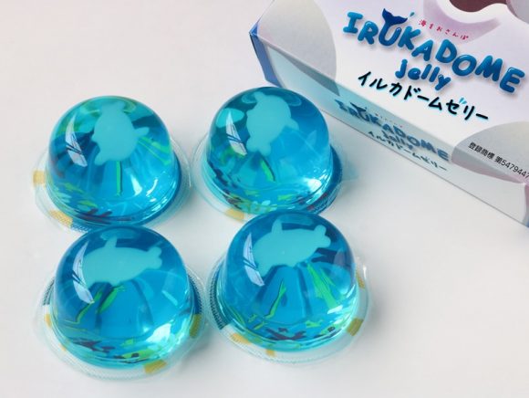 「イルカドームゼリー」は、ラムネ味の青く透き通ったゼリーの中にイルカの形をした白いゼリーが入ったドーム型のゼリーです。