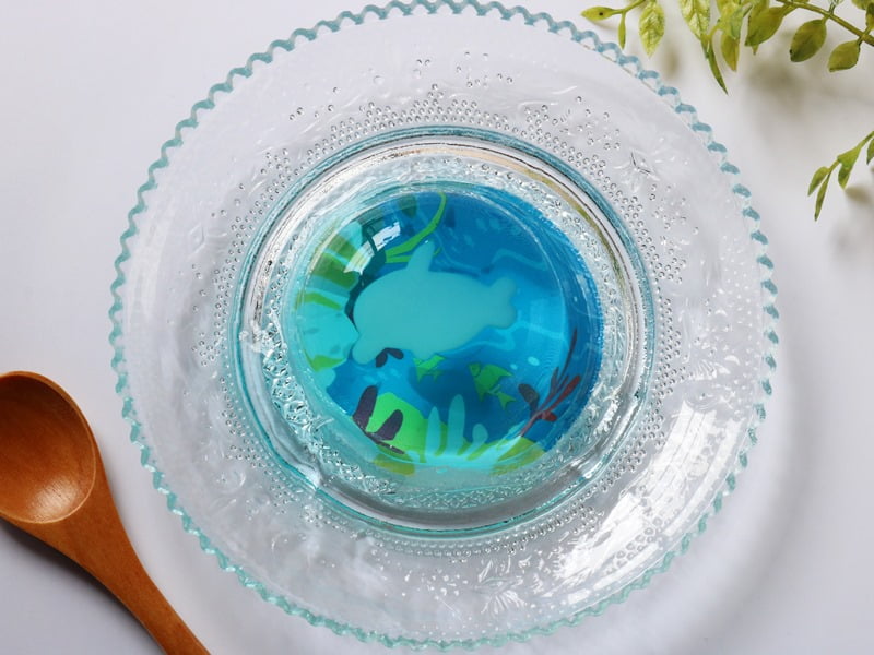 ゼリー自体は透き通ったラムネゼリーと白いイルカゼリーのみというシンプルなものですが、蓋を底に敷いてからゼリーをポンとお皿にあければ、写真のように魚や海草など海の中のイラストがゼリーに映し出されますよ。