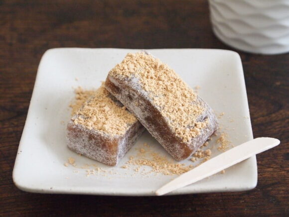 1つのパックに2個お餅が入っていて、1個のサイズは5.0cm×2.5cm×1.5cmです。きな粉が別袋で付いています。