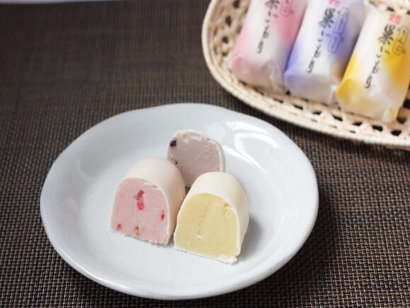 中身がそれぞれ違うフルーツ餡になっていて、外見からも少し餡の色が透けてみえるのが印象的でした。