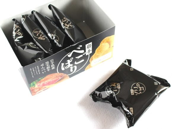 岩手べごぱりは、岩手県産の黒毛和牛のおいしさがギューっとつめ込まれたおせんべいです。