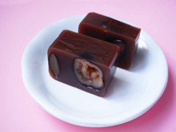 花豆餡をふんだんに使った羊羹は、艶のある見た目が特徴的。