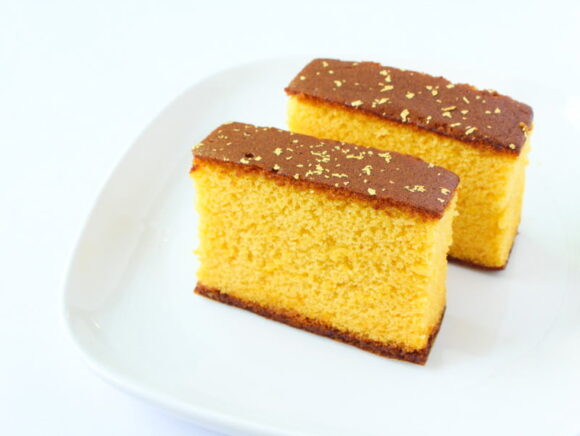 カステラの上にのせられた金粉が高級感のある雰囲気を醸し出していますよ。