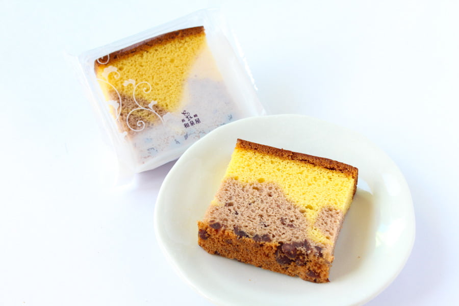 小豆カステラと蜂蜜カステラのマーブル柄がとても美しいのが印象的。