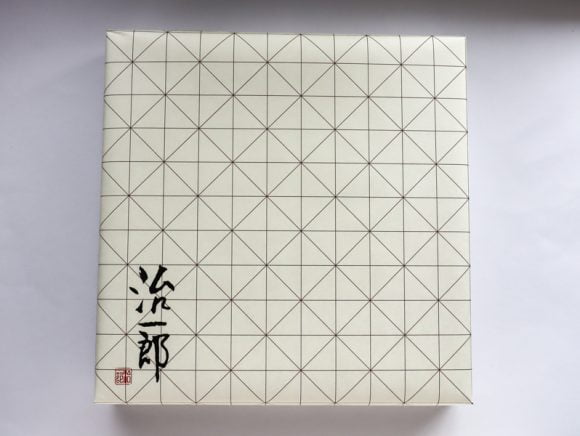 包み紙は整然と敷き詰められたタイルをイメージさせるモザイク柄。左下にある「治一郎」の文字は存在感がありますね。