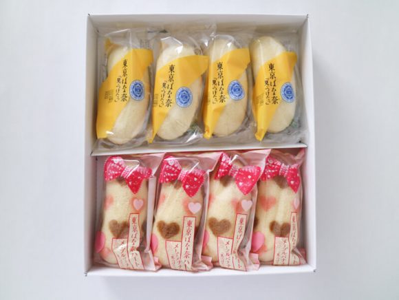 東京ばな奈シリーズで一番人気のプレーンと、一番かわいいと言われるハートマーク柄のメープルバナナ味が4つずつ入っています。普段は手に入らない2種類入りの東京ばな奈ですよ。