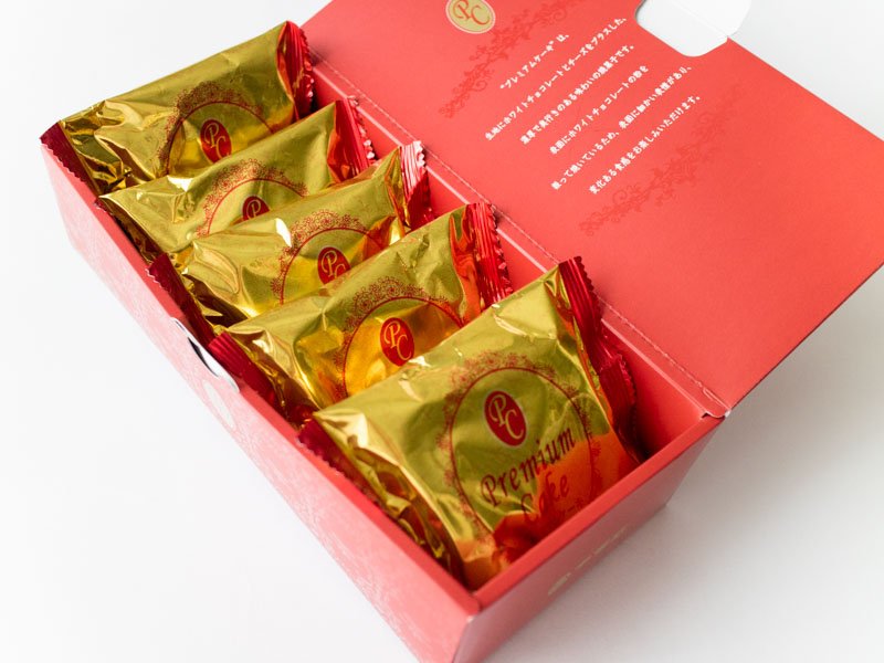 和菓子のイメージが強い十万石ですが、洋菓子の種類も豊富です。プレミアムケーキは、生地にホワイトチョコレートとチーズを加えた焼き菓子。表面にホワイトチョコレートの粉を振って焼き上げているんだそう。