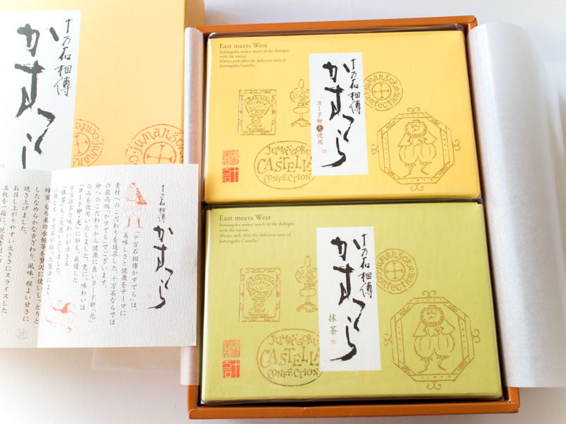 十万石相傳(そうでん)かすてらは、美味しさと健康をテーマに素材のこだわりを追求した一品。ベーシックな「ヨード卵・光」と京都宇治産の「抹茶」2種類です。