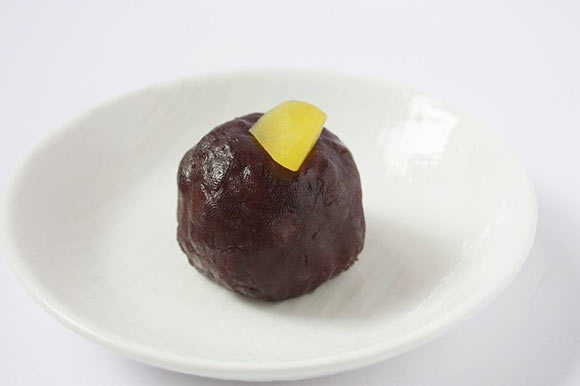もち米をつぶあんで包んでおり、てっぺんにはくりがトッピングされています。