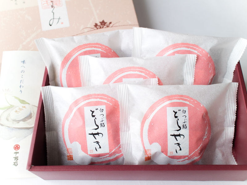 白つぶ餡どらやきは、北海道産白隠元豆を使用したつぶし餡をふっくらと焼き上げた皮で包んでいます。十万石では他に丹波大納言どらやきもありますよ。