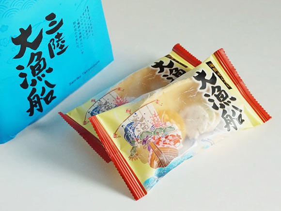 海のように真っ青な包装のなかには、大漁旗をかかげた大漁船のイラスト入りの個包装が。いかにも縁起がよさそうです。