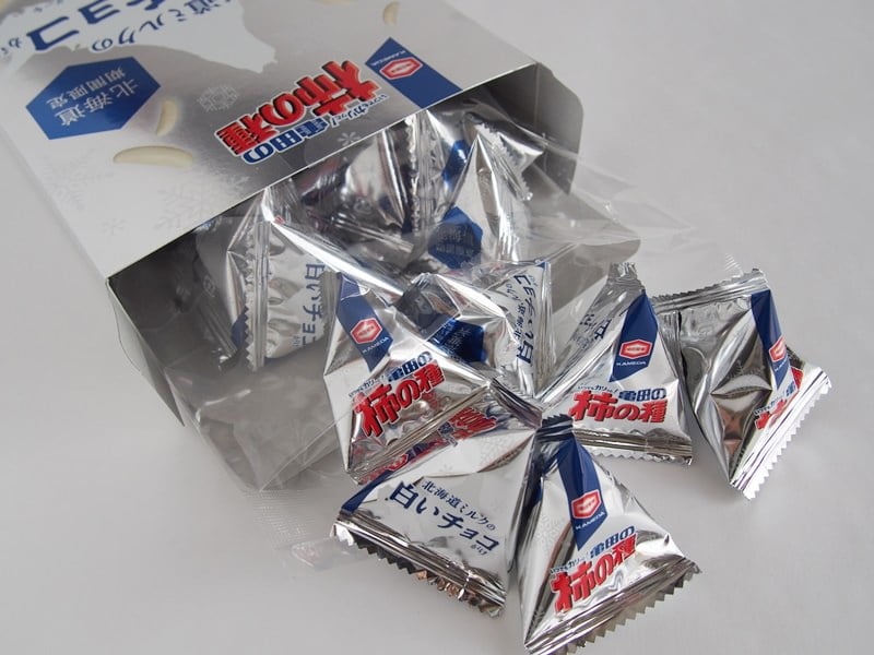 柿の種 北海道ミルクの白いチョコがけは、亀田製菓から販売されている北海道期間限定の商品。