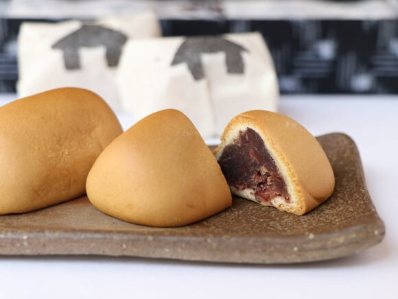 北海道産小豆から炊き上げた粒餡を、皮で包んだ長さ6cmほどの三角柱のような形のお菓子で、この形は静かな茅葺の田舎家をイメージして作られたのだとか。