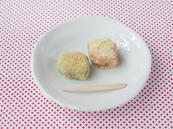 ピンクのうぐいす餅は白あん入りで、外側には青大豆のきな粉がまぶしてあります。