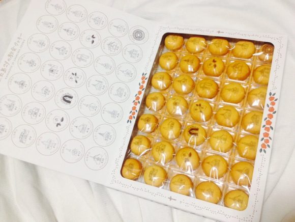 お箱を開けると、一口で簡単に食べれてしまう小さなクッキーが35個並んでいます。そして、全部に違う絵が描かれているので、食べるのがもったいないくらいにとっても可愛くて楽しい商品です。
