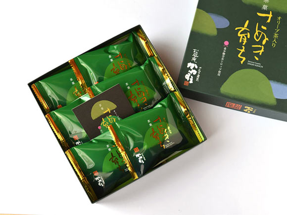 中は抹茶餡がはいっていますが、餡をくるむ皮にはオリーブ茶が使われているためオリーブの独特の風味が口に中に広がりますよ。とはいっても苦くはないので安心して下さいね。