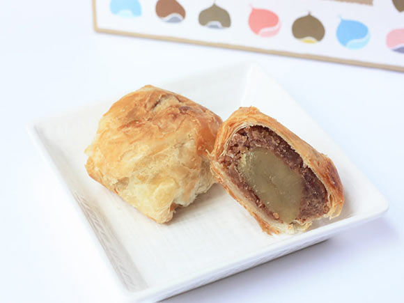 栗の実を丸ごと、栗の渋皮煮ペーストで包み、こんがりと焼いたパイのお菓子です。