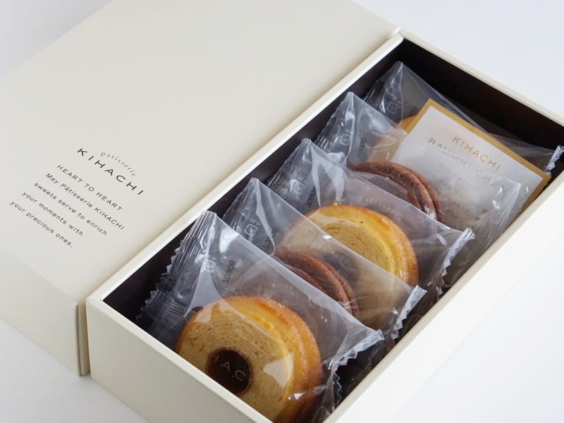 5個入りが1,296円、8個入りが2,160円、12個入りが3,240円(税込)で、パティスリーキハチの店舗およびオンラインショップで購入できますよ。