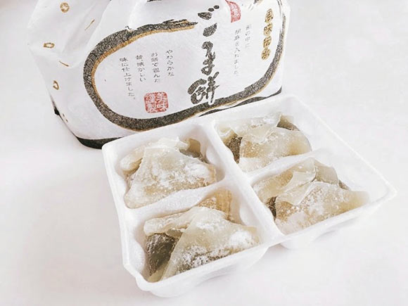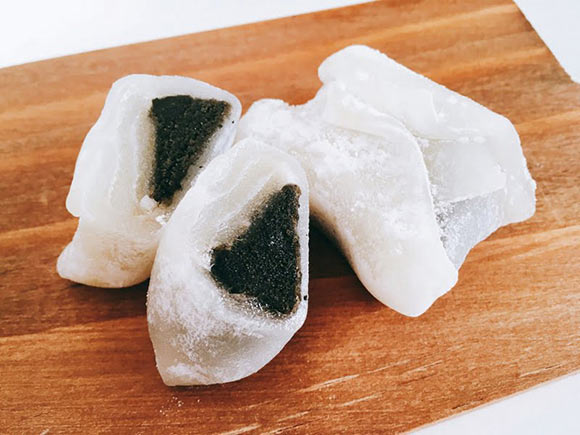 四角く折りたたまれた餅の中には、しっとりとした黒ごまあん入り。