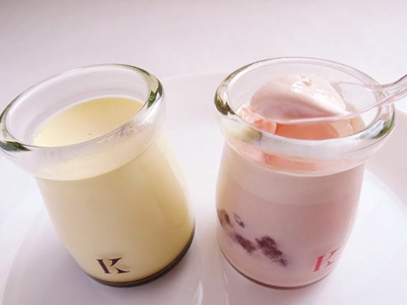 食べる前にプリンをよく見ると、プリンの層が二層になっていることに気づきます。1センチぐらいの白いプリンの層の下に、薄ピンクのプリンの層があります。