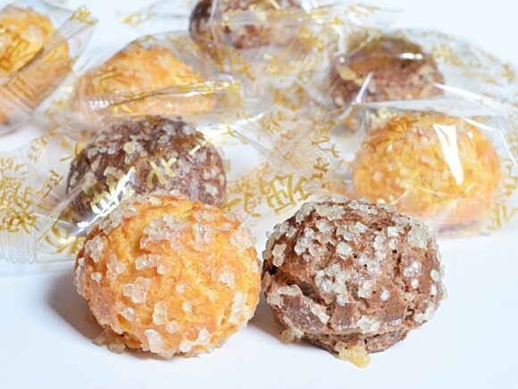 シュー生地の表面にはザラメがまぶされており、すごく甘そうに見えますが、実際に食べてみるとどちらの味も優しい甘さ。ちなみに、中は空洞になっています。