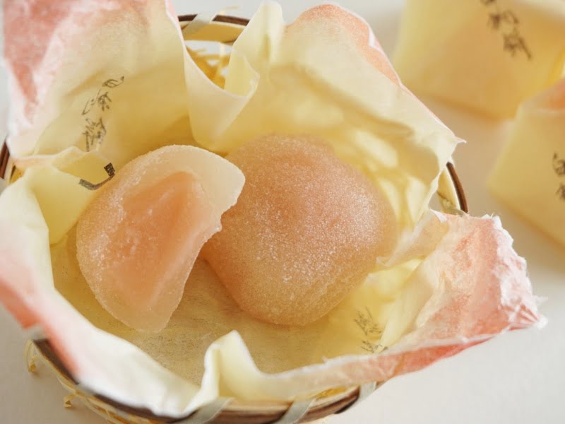 ころんとまあるい餅は、透明な生地にピンクのあんが透けて見え、まさに白桃を思わせる色合い。