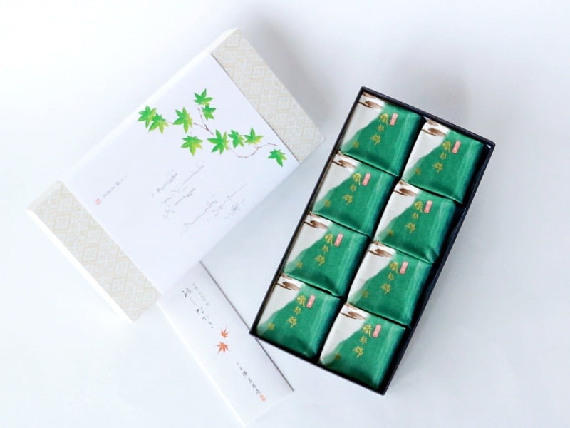 うぐいす色の上質の紙で丁寧に包装されているので、改まった進物や手土産におススメな和菓子です。