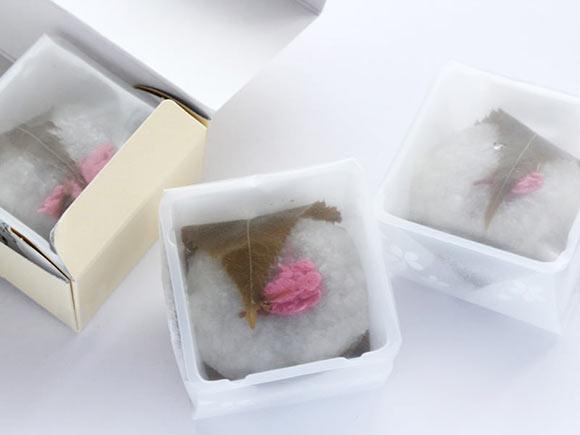 真っ白の道明寺はきらきらと光り輝き、その上に添えられている桜の花が美しい。