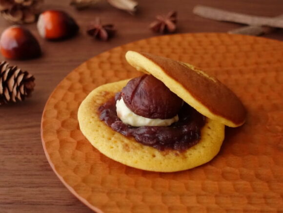 蜜煮された渋皮栗まるごと一粒と小豆あん・バターホイップを、貴重な米あめを使用した生地にはさんだどら焼きです。