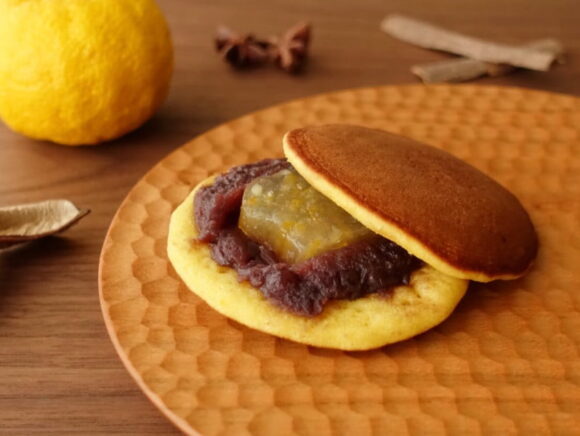 柚子としょうがの錦玉羹(きんぎょくかん)、小豆あんを、貴重な米あめを使用した生地にはさんだどら焼きです。