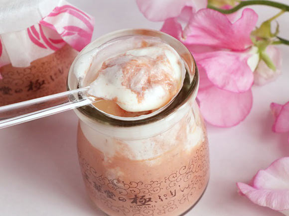 極ぷりん 苺は、静岡県産の苺「紅ほっぺ」のピューレーを使用したピンク色のプリン。