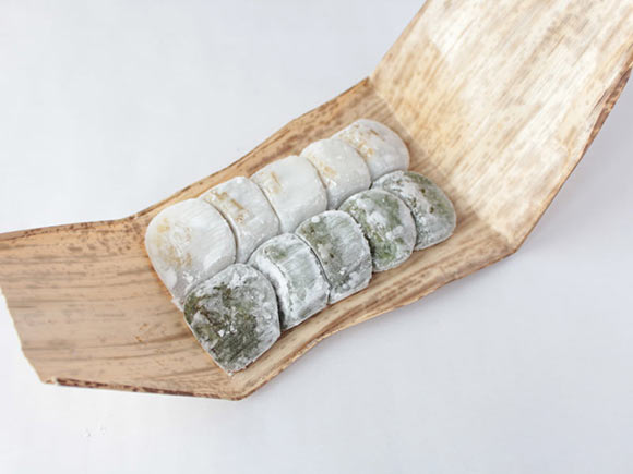 白とよもぎ2種類の皮につぶあんが入ったお餅ですよ。