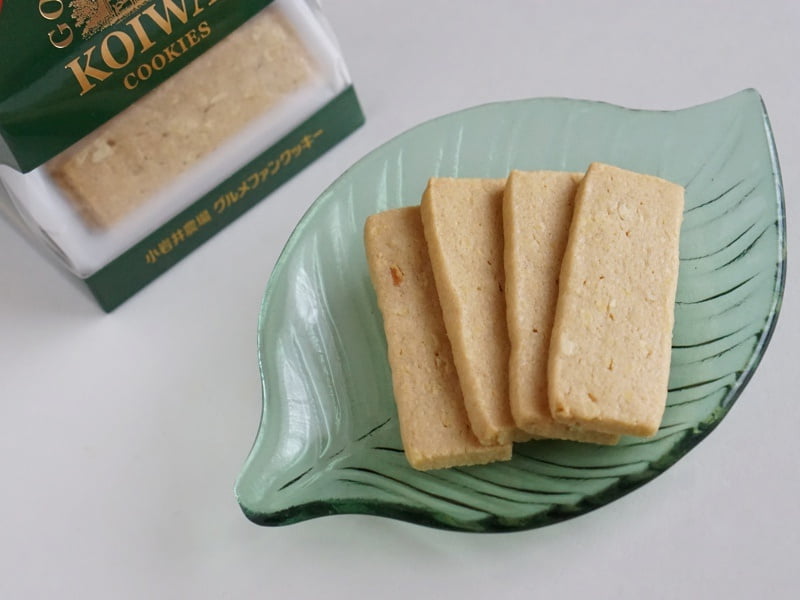 焼き色が薄めの板状のクッキーで、表面にはマカダミアナッツのつぶつぶも見えますね。