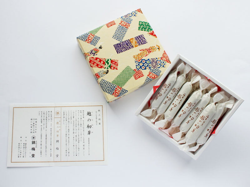 越の初芽は、錦梅堂各店舗、オンラインショップ、福井駅などで購入することができます。
