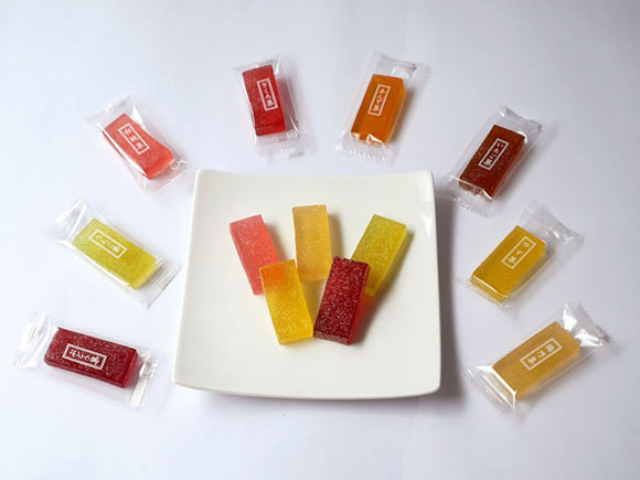 フルーツ本来の味を楽しめるよう、国内産の果汁をたっぷりと使っているのが特徴(ザクロのみ台湾産)で、半透明な宝石のようにカラフル。