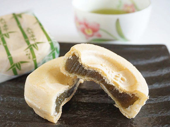 呉竹最中は、青のり入りの白あんを竹のかたちの最中に包んだお菓子。