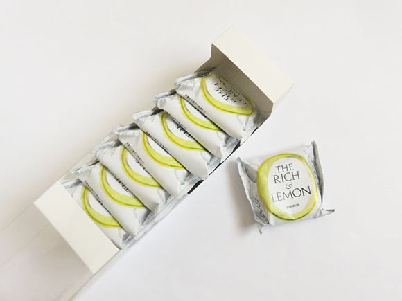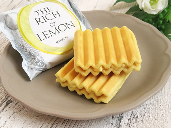 この「リッチレモン」は、ワッフル生地にレモンの濃厚なクリームをサンドした爽やかテイストの焼菓子です。