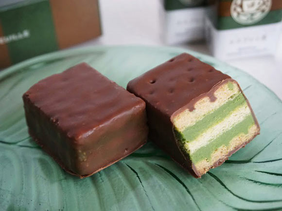 京都ヴェネトのエスプレッ茶は、抹茶クリームをパイでサンドし、チョコレートでコーティングしたお菓子。