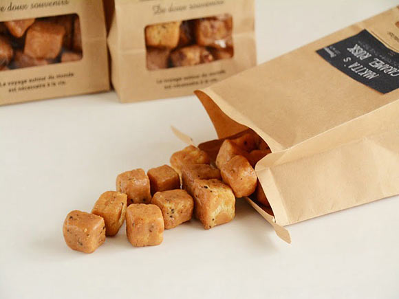 写真のラスクは、コショウ入りのキャラメルラスク。キャラメルの甘さの中にピリッとしたコショウがきいてる大人の味に仕上がっています。